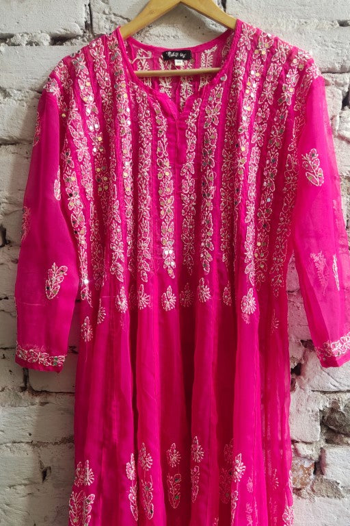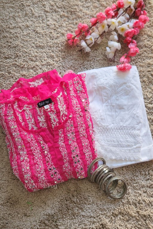 Introducing our stunning Fuchsia Pink 56 Kali Chikankari Anarkali Kurta with Pant set, a masterpiece of elegance and craftsmanship. Elevate your style with this exquisite ensemble that seamlessly blends tradition and modernity. Here's why this ensemble deserves a place in your wardrobe: