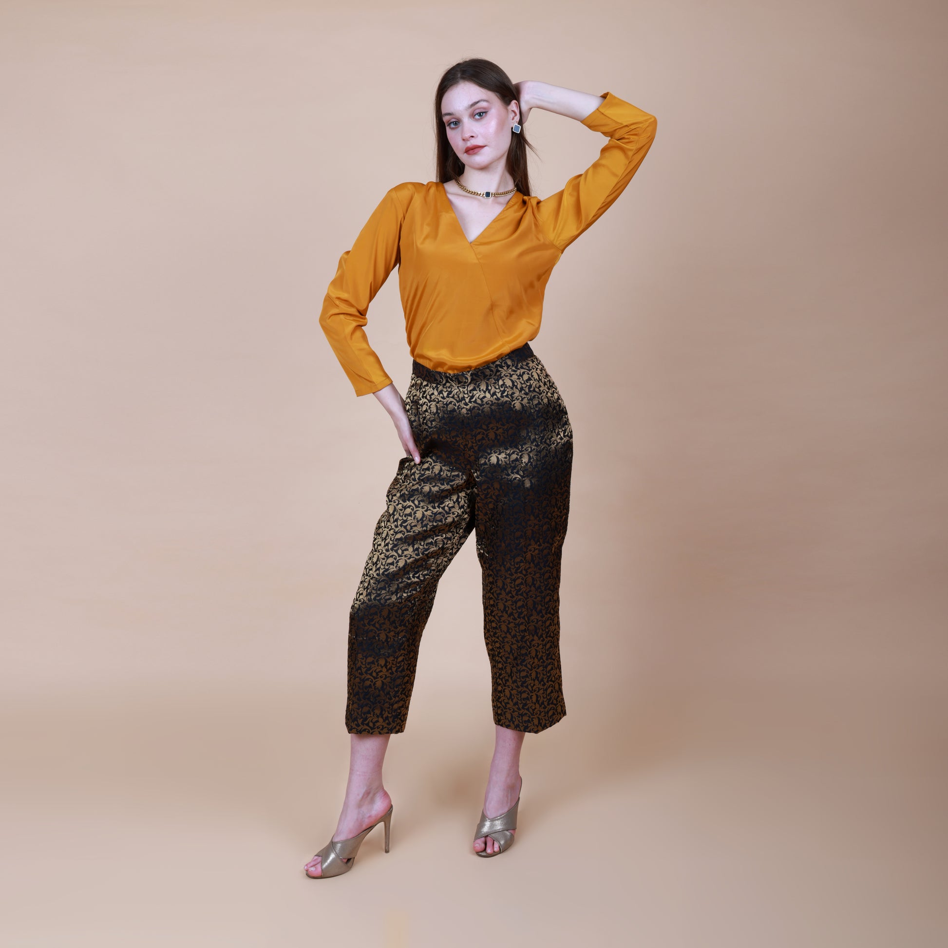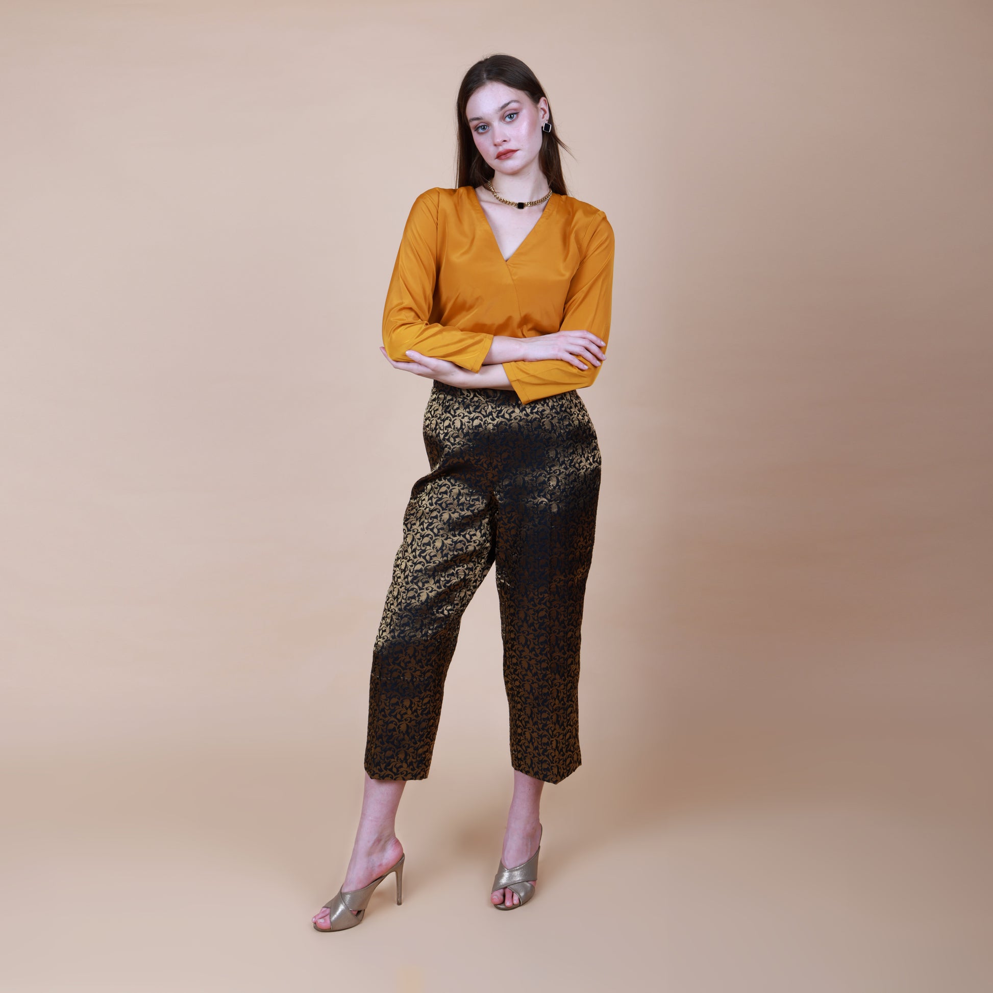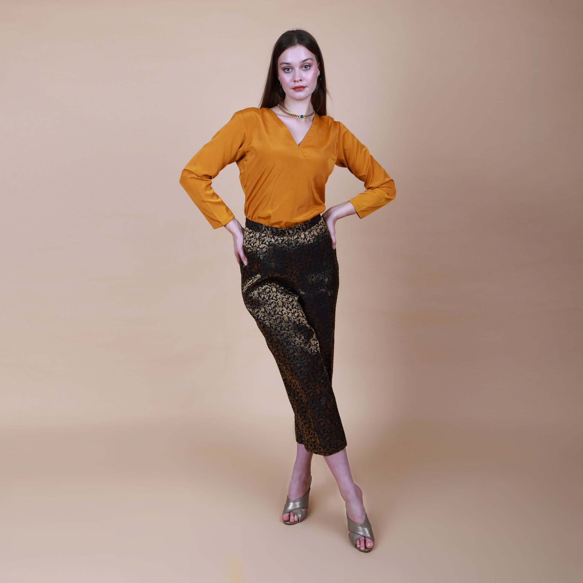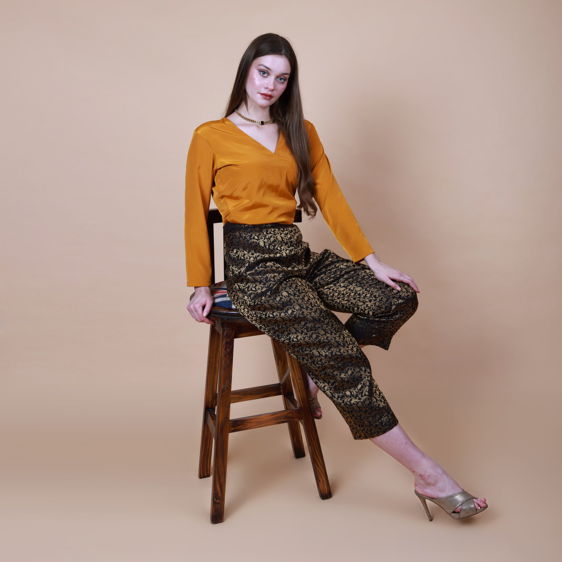 Make a bold statement with our Silk Brocade Pant and Top Set for Women. Featuring luxurious black brocade straight pants with golden Banarasi weaving and a chic mustard yellow crepe top, this set is designed to turn heads.