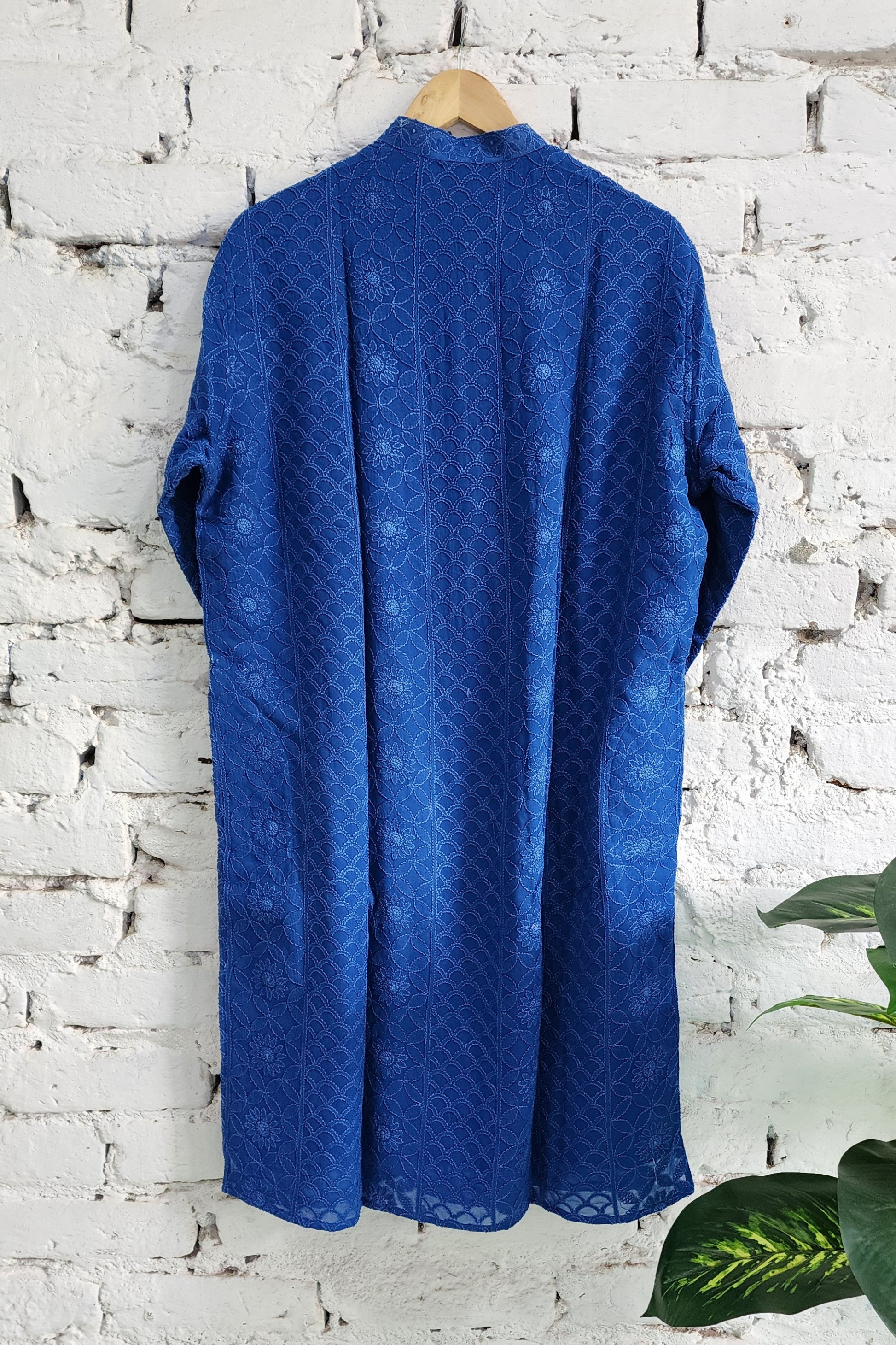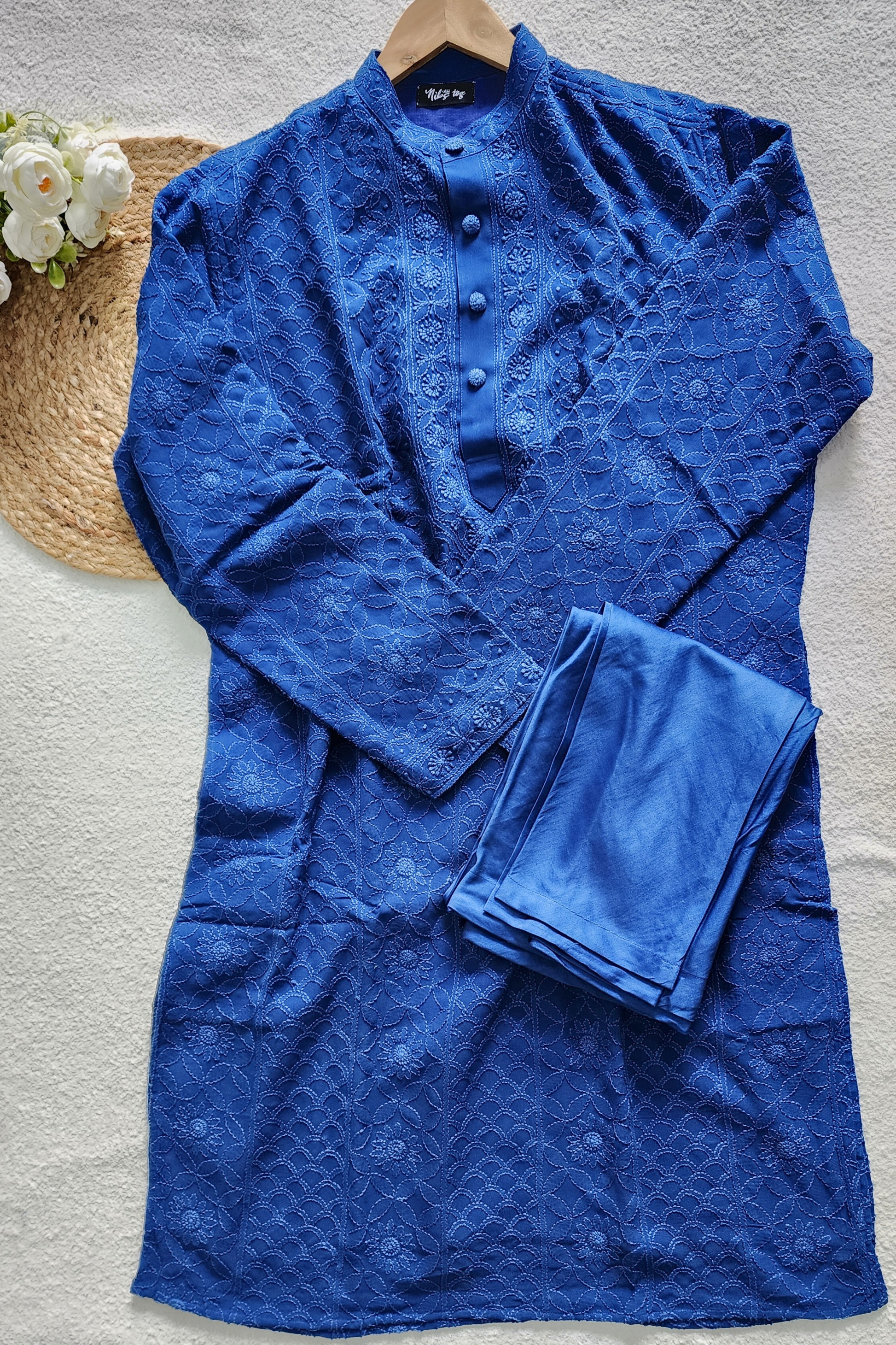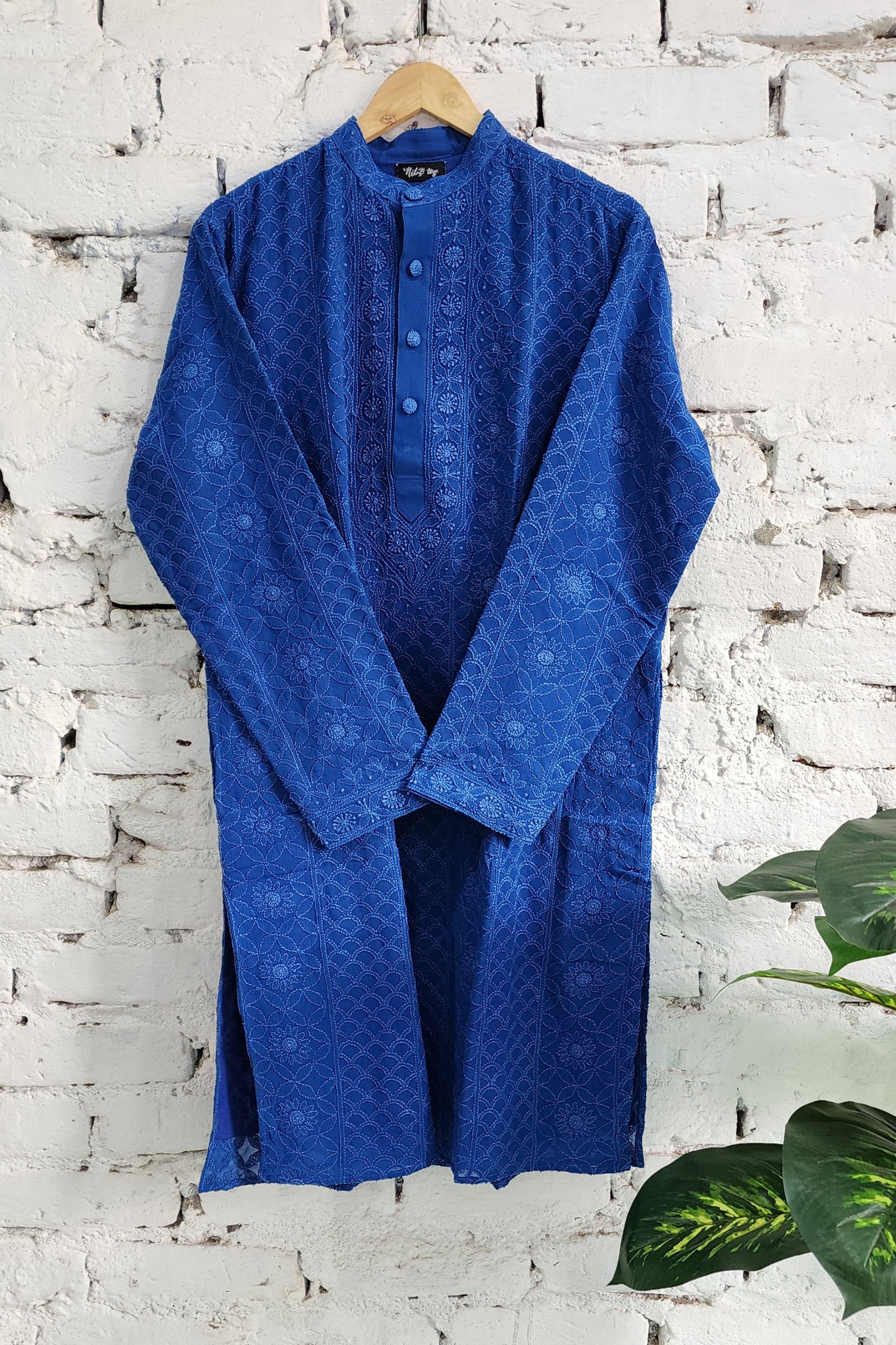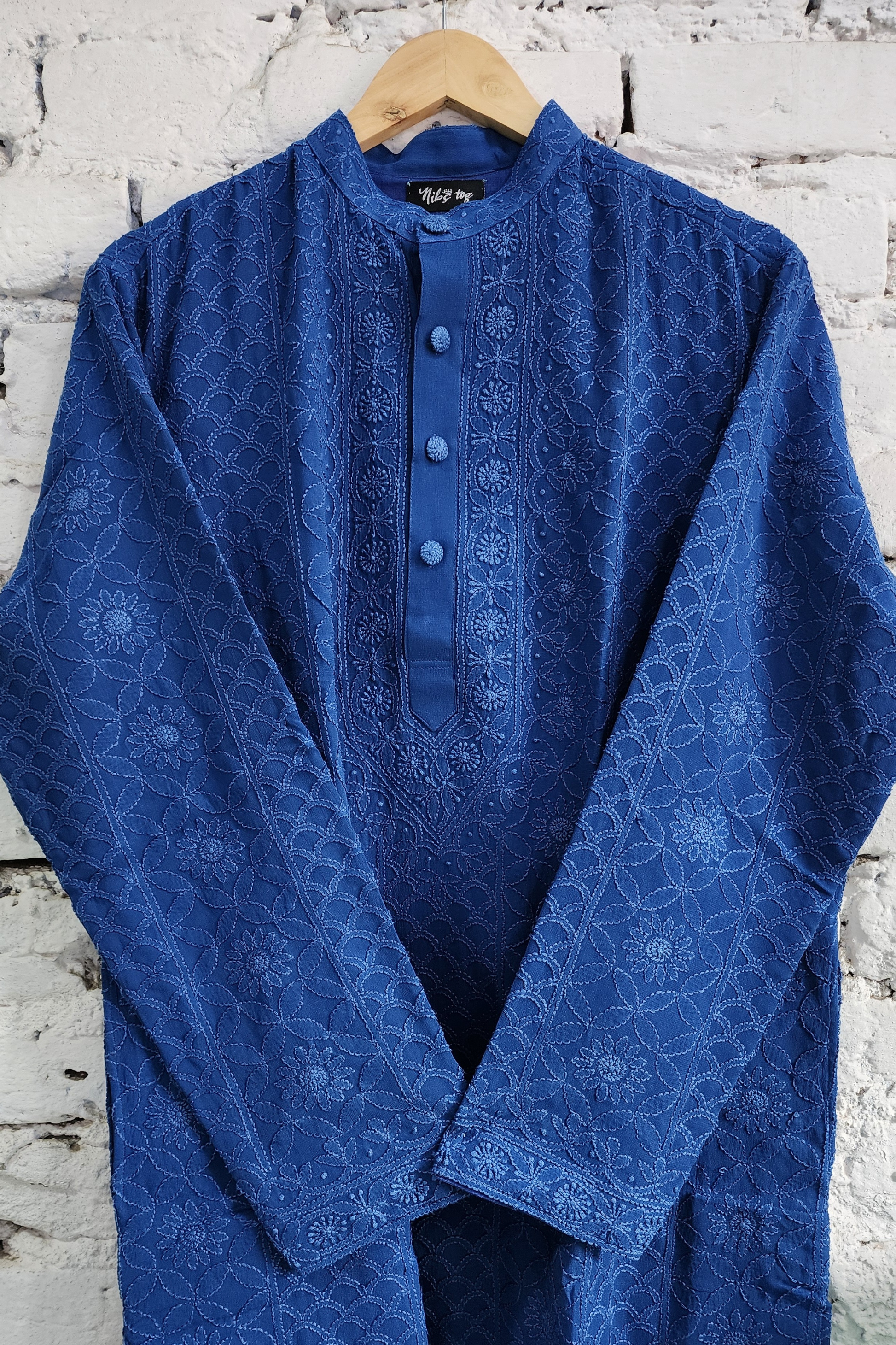Blue Mens Chikankari Kurta with churidar Pure Viscose Georgette