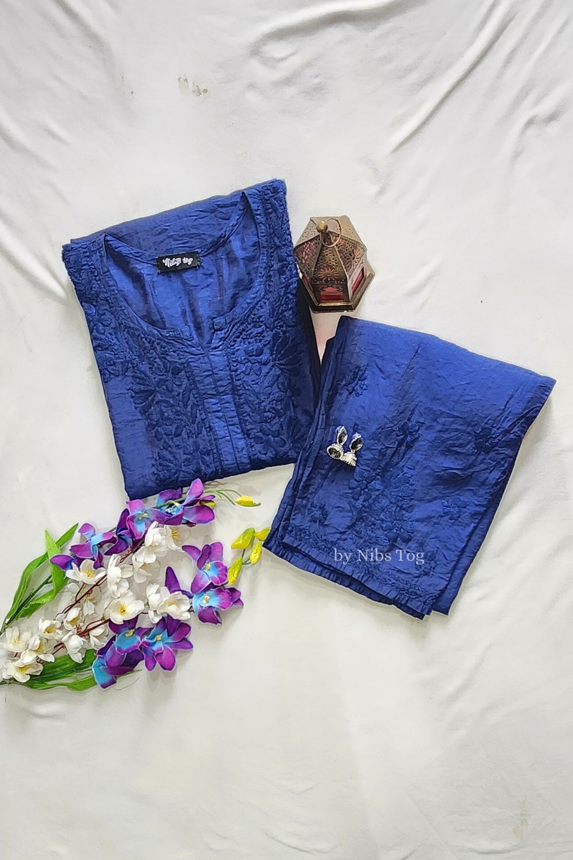 Nibs Tog Handmade Blue Silk Chikankari Kurta Palazzo Set for Women