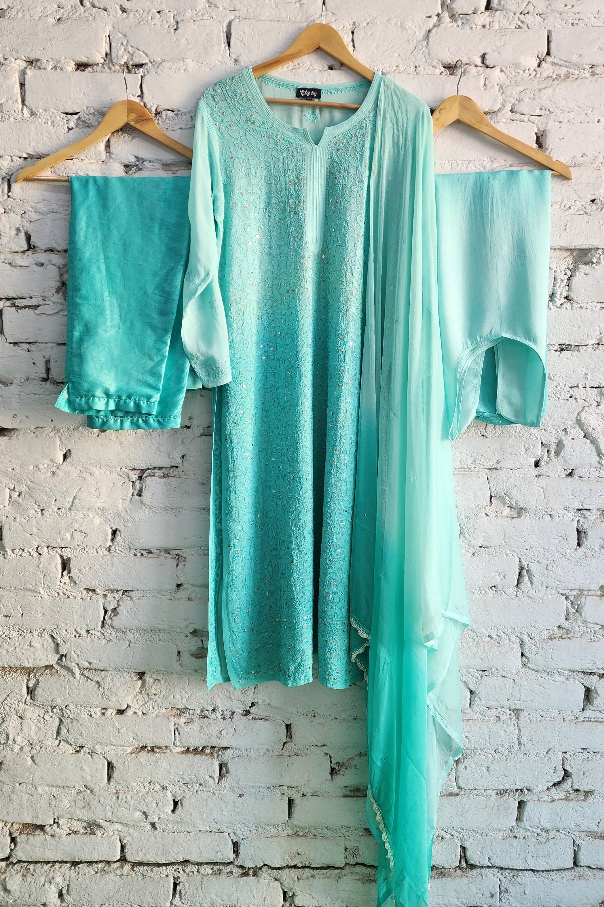 Bring home this timeless Ombre Sea Green Chikankari Kurta Pant Set today and redefine elegance. Click “Add to Cart” now and experience the perfect blend of tradition and style!