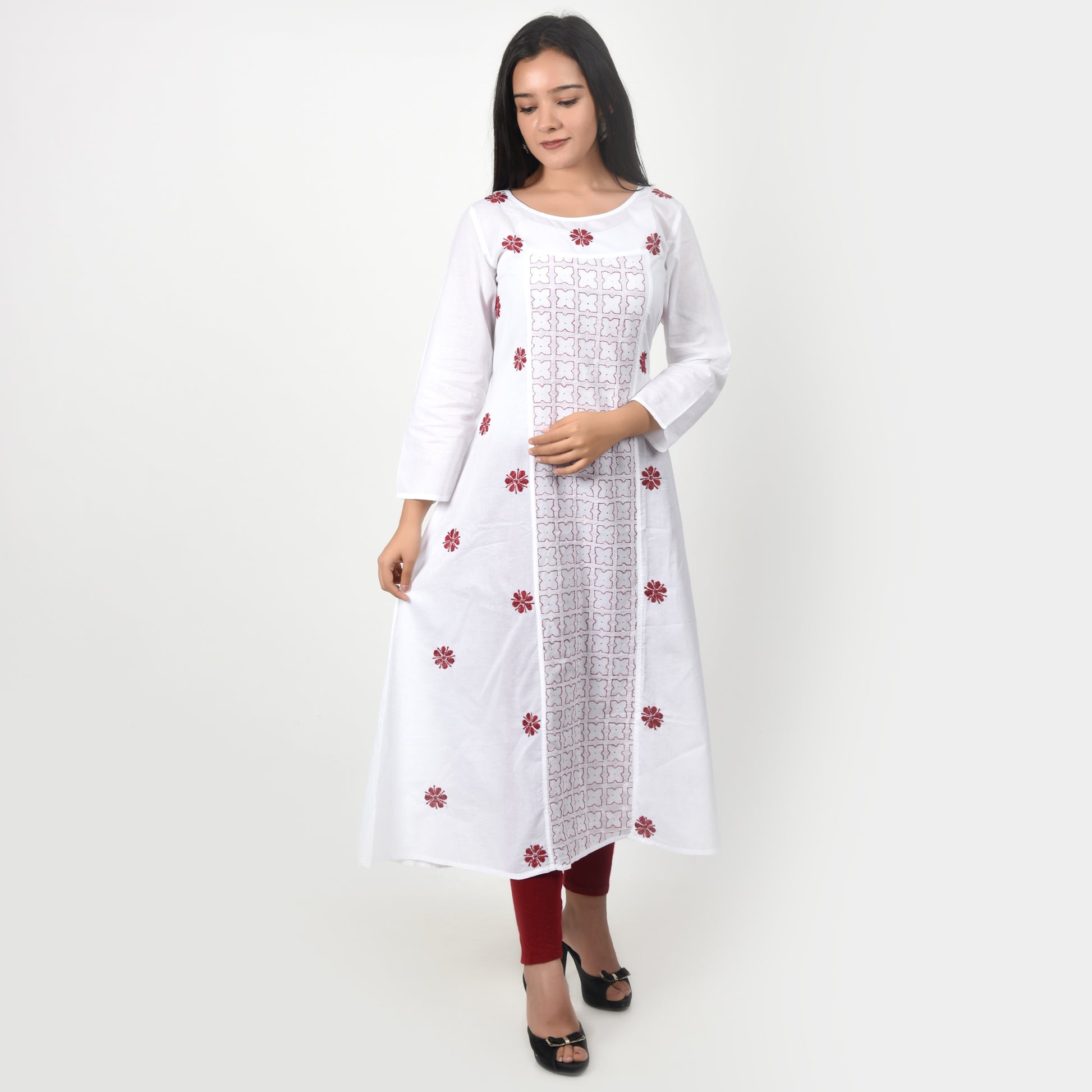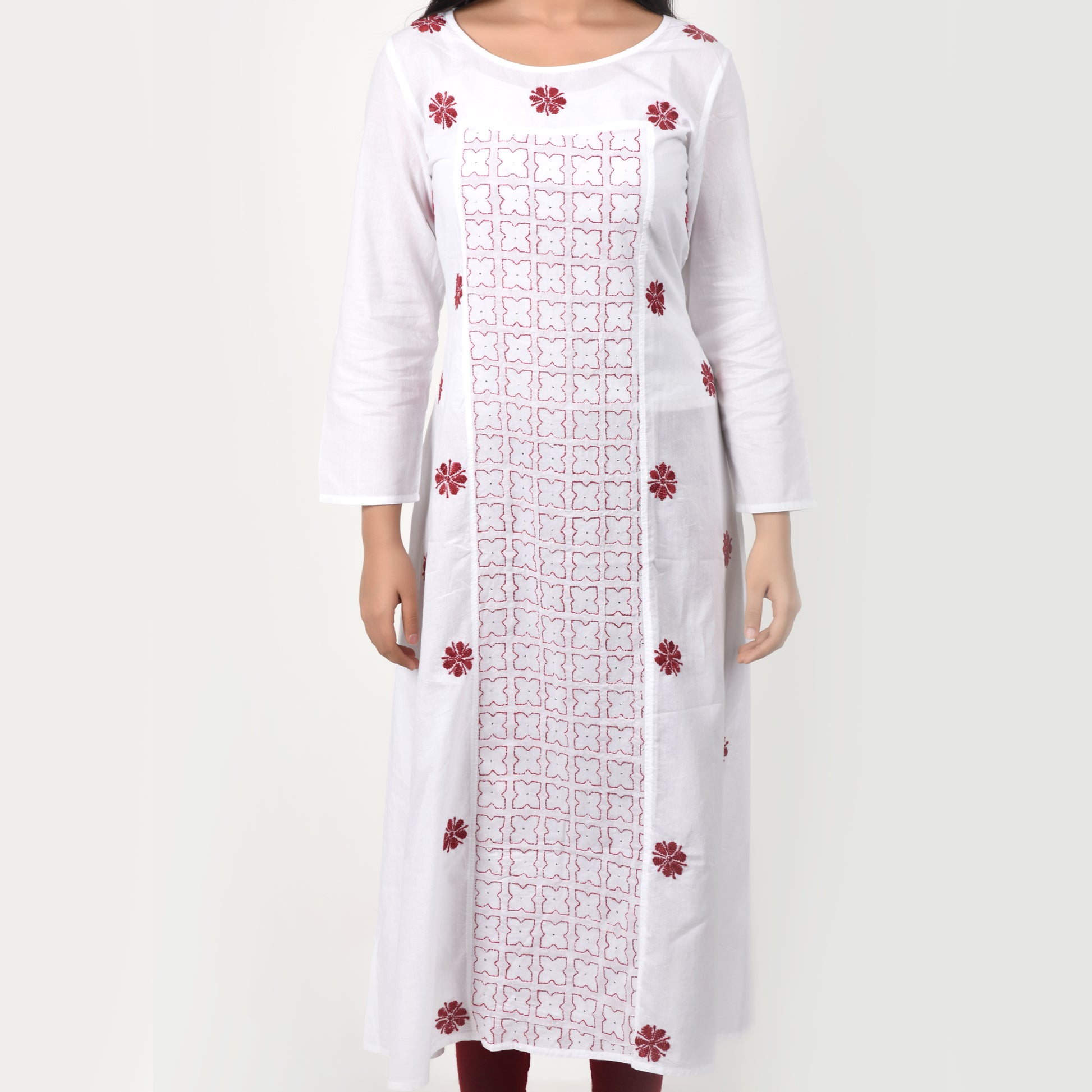 Cotton Chikankari Kurta A Line White and Maroon Medium