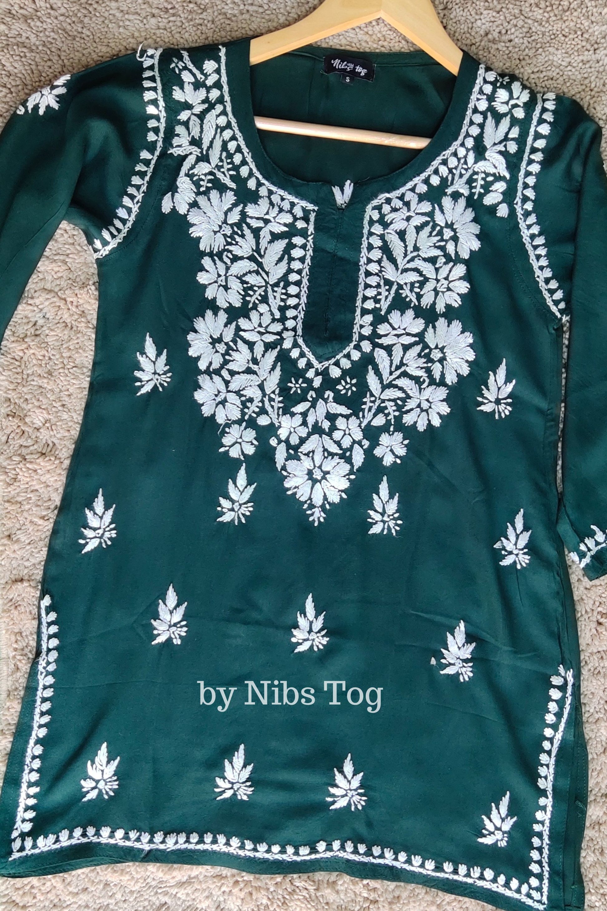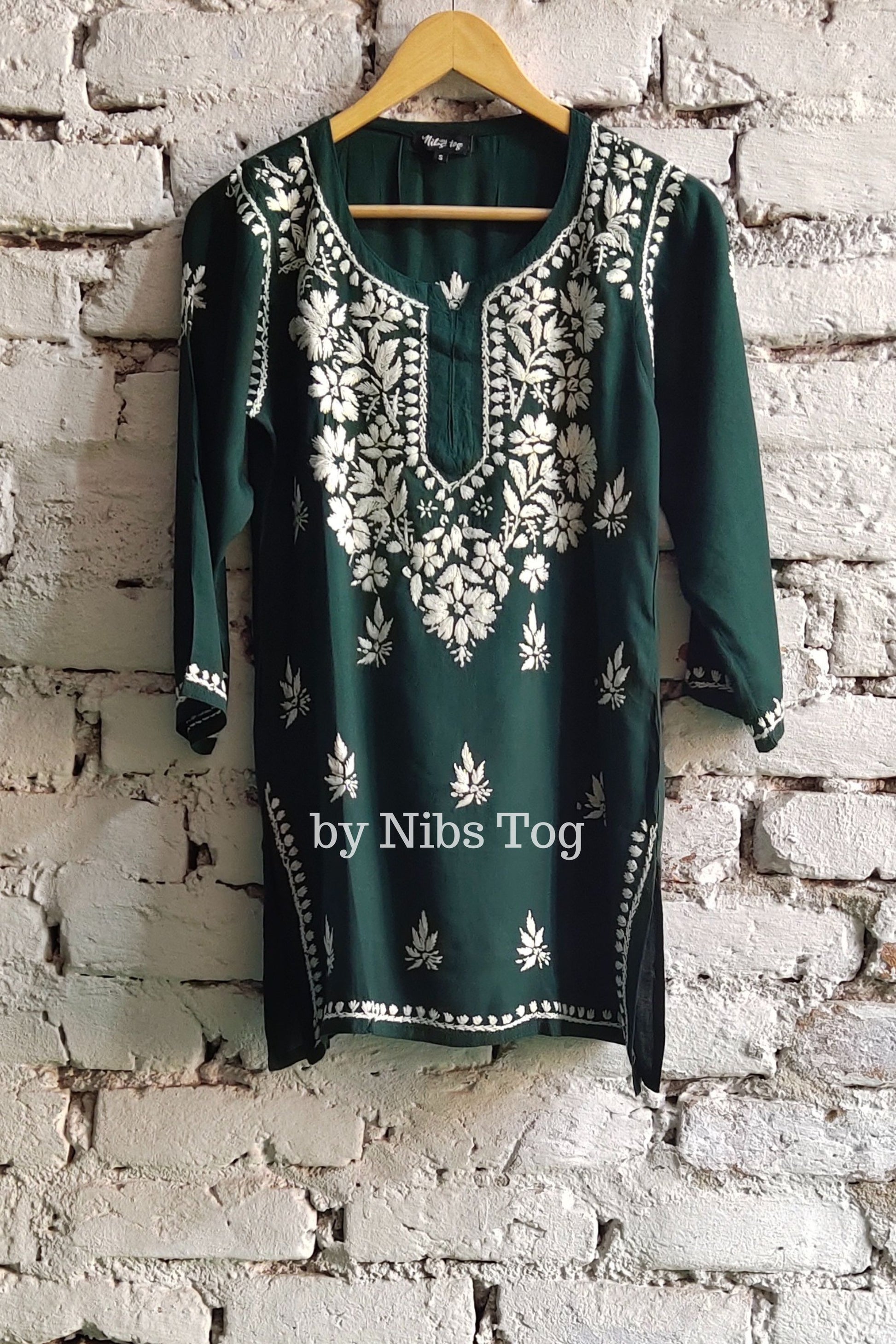 Nibs Tog Dark Green Rozana Cotton Chikankari Short Kurta/Top for Women