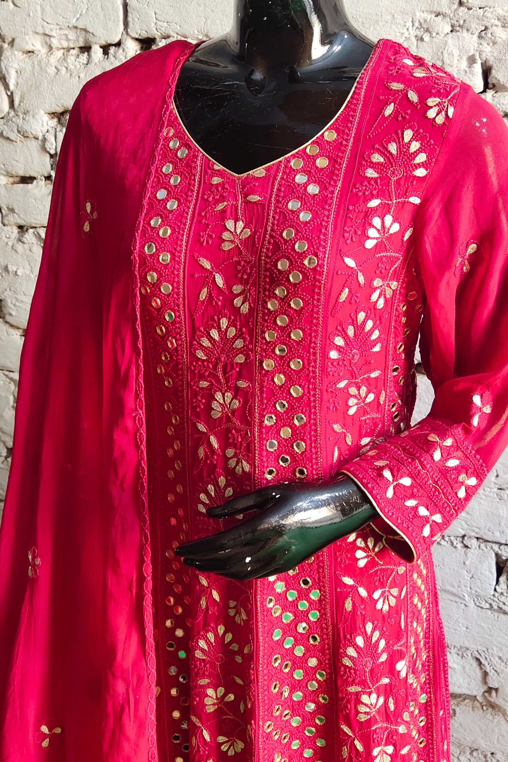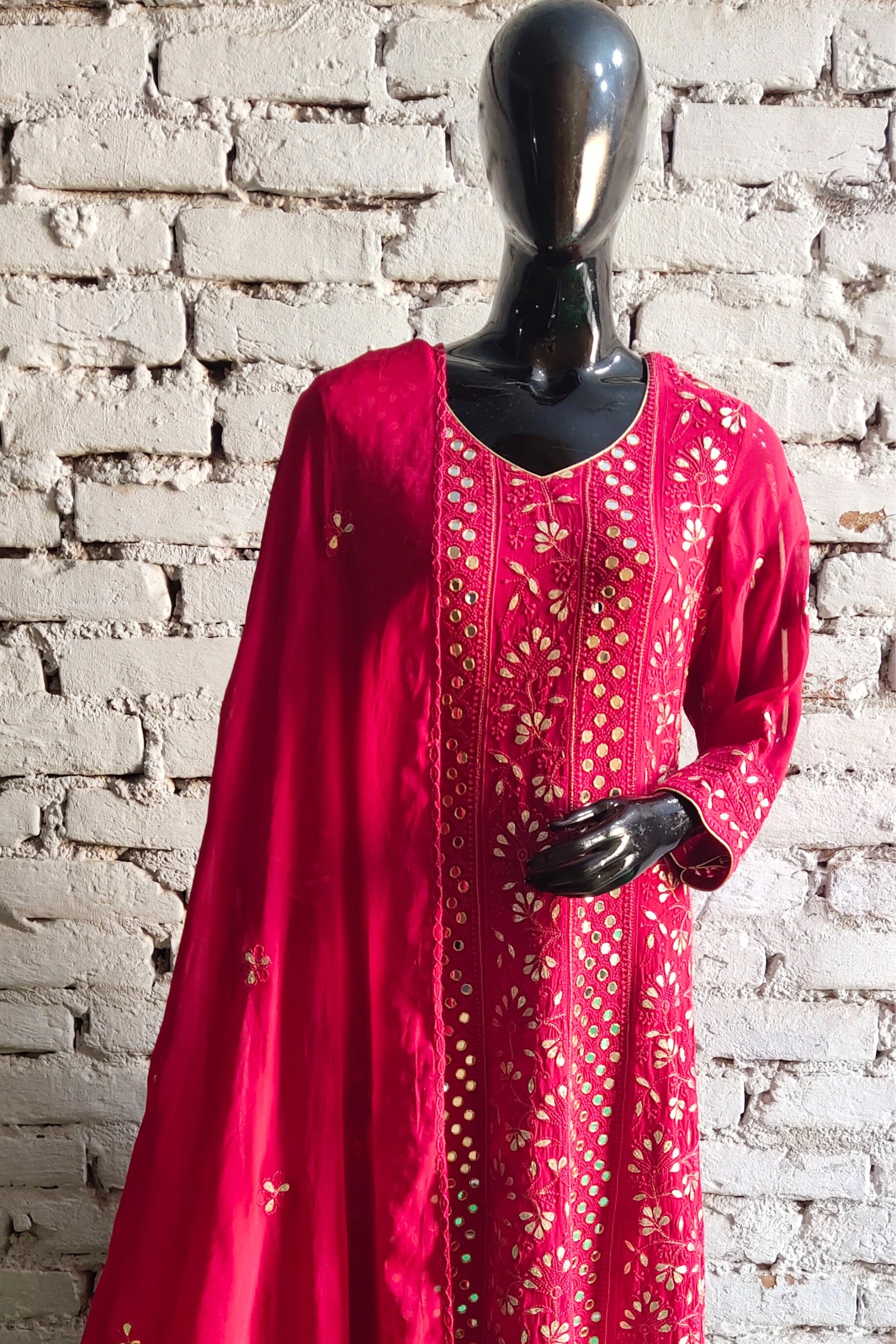 Deep Red Chikankari Anarkali Suit with Gotta Patti and Mirror