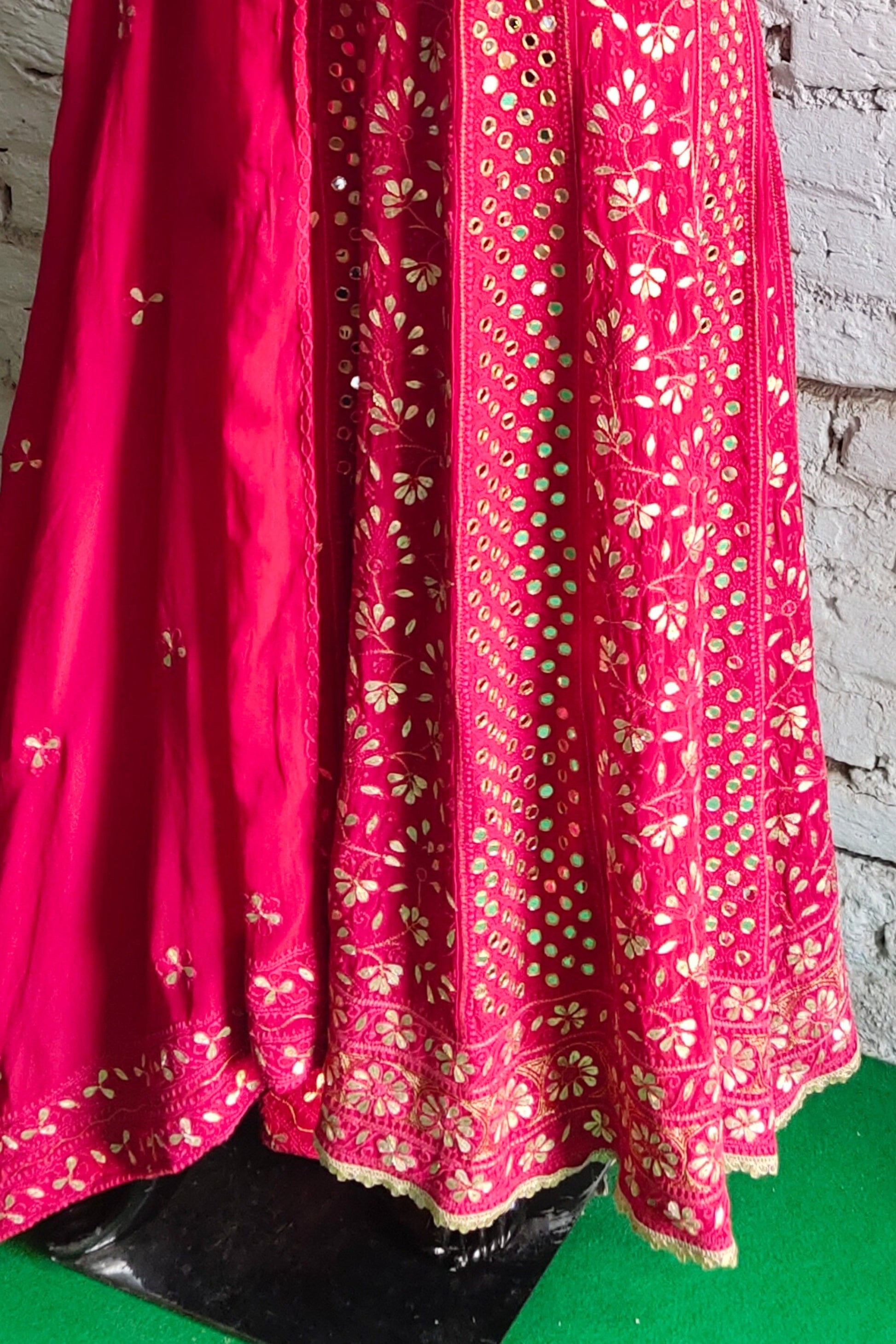Make a grand entrance with this handcrafted Deep Red Anarkali Suit. Featuring authentic Chikankari embroidery, mirror accents, and Gota Patti detailing, this ensemble is perfect for weddings, receptions, and festive celebrations.