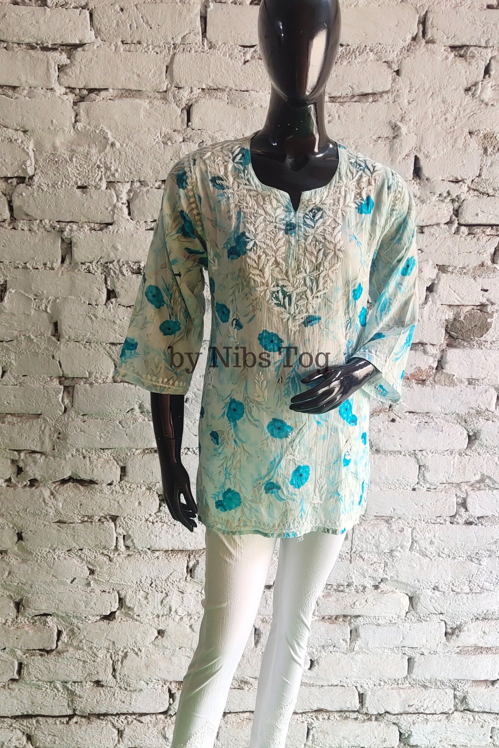 Nibs Tog Floral Print Mulmul Cotton Short Chikankari Kurta Blue