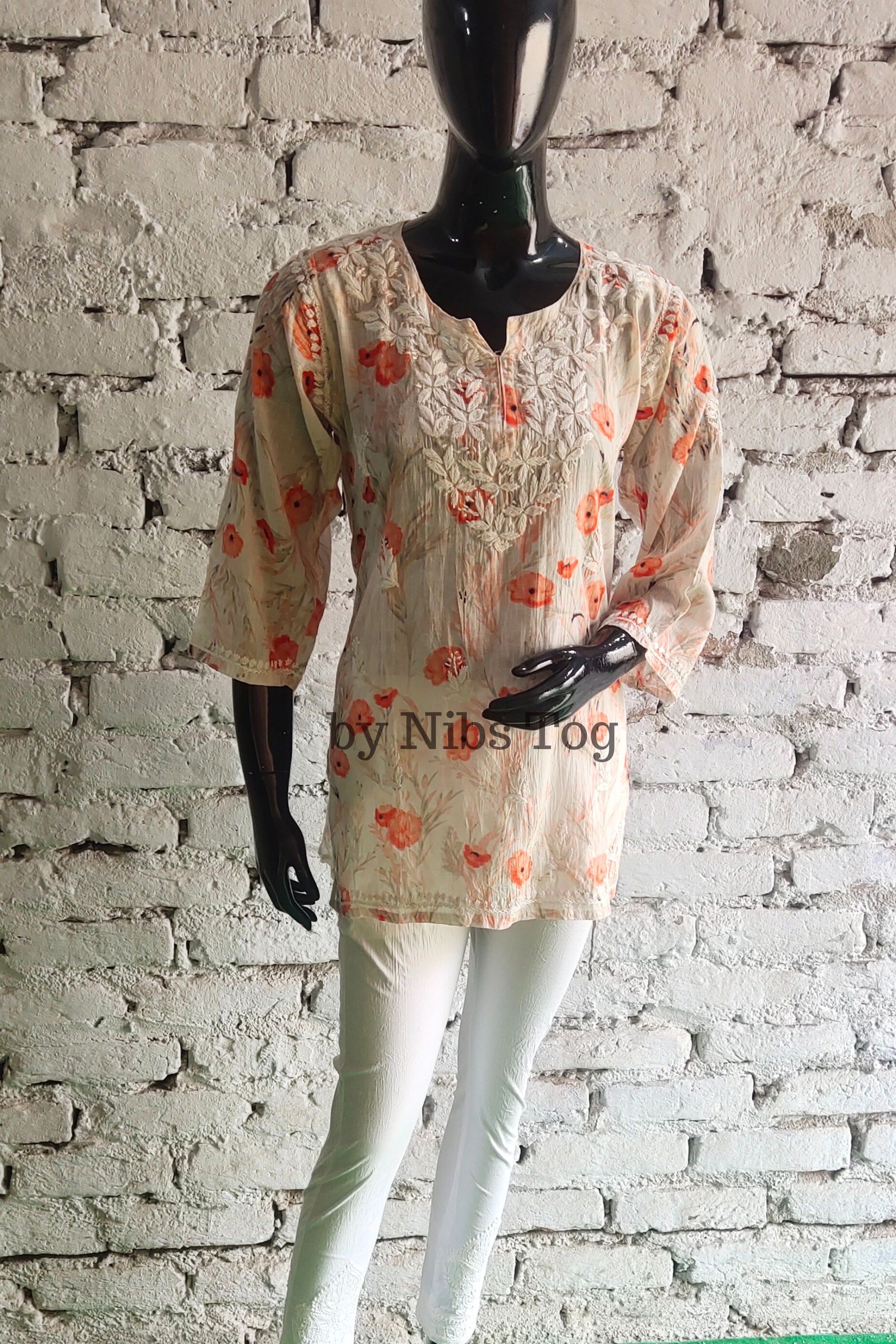 Nibs Tog Floral Print Mulmul Cotton Short Chikankari Kurta Peach