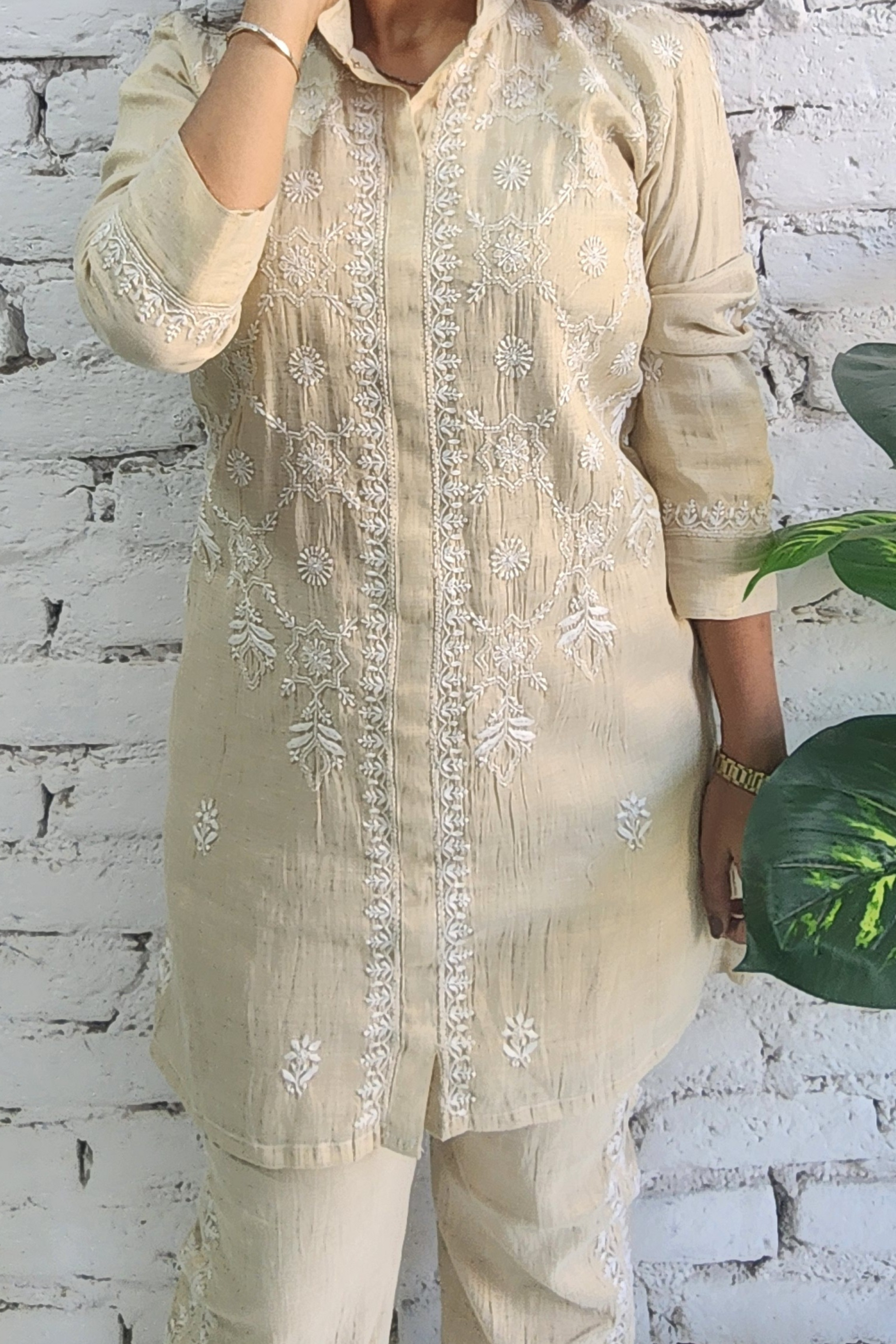 Elevate your festive and everyday wardrobe with this elegant Beige Tissue Silk Chikankari Coord Set. Crafted with timeless chikankari hand embroidery on a rich tissue silk base, this semi-stitched coord set allows you the freedom to customize it as per your size and styling preference. Its luxurious beige-gold hue with white thread detailing makes it a versatile choice for special occasions and intimate gatherings.
