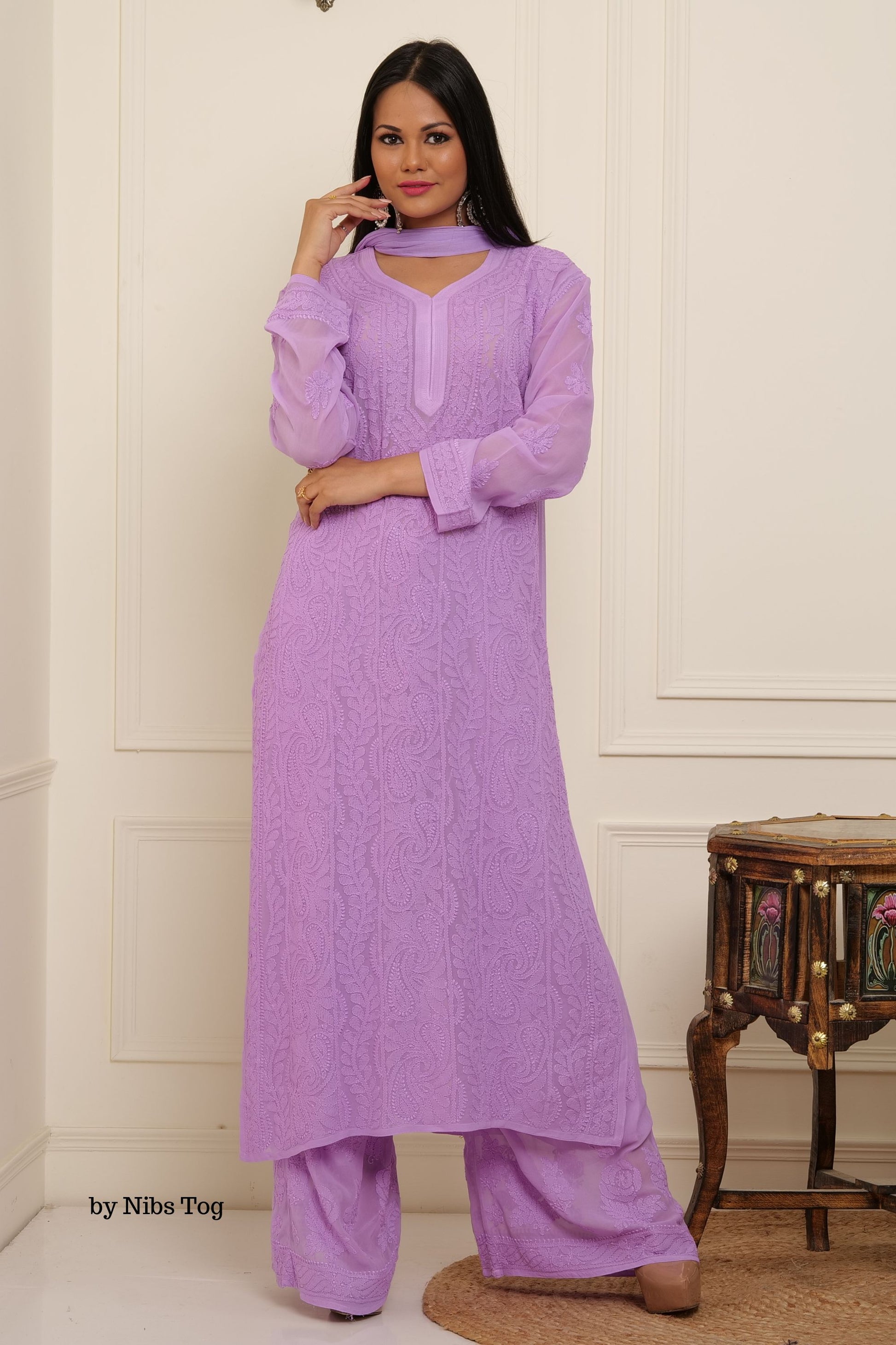 Nibs Tog Lilac Nazaqat Chikankari Kurta Palazzo Set with Dupatta for Women