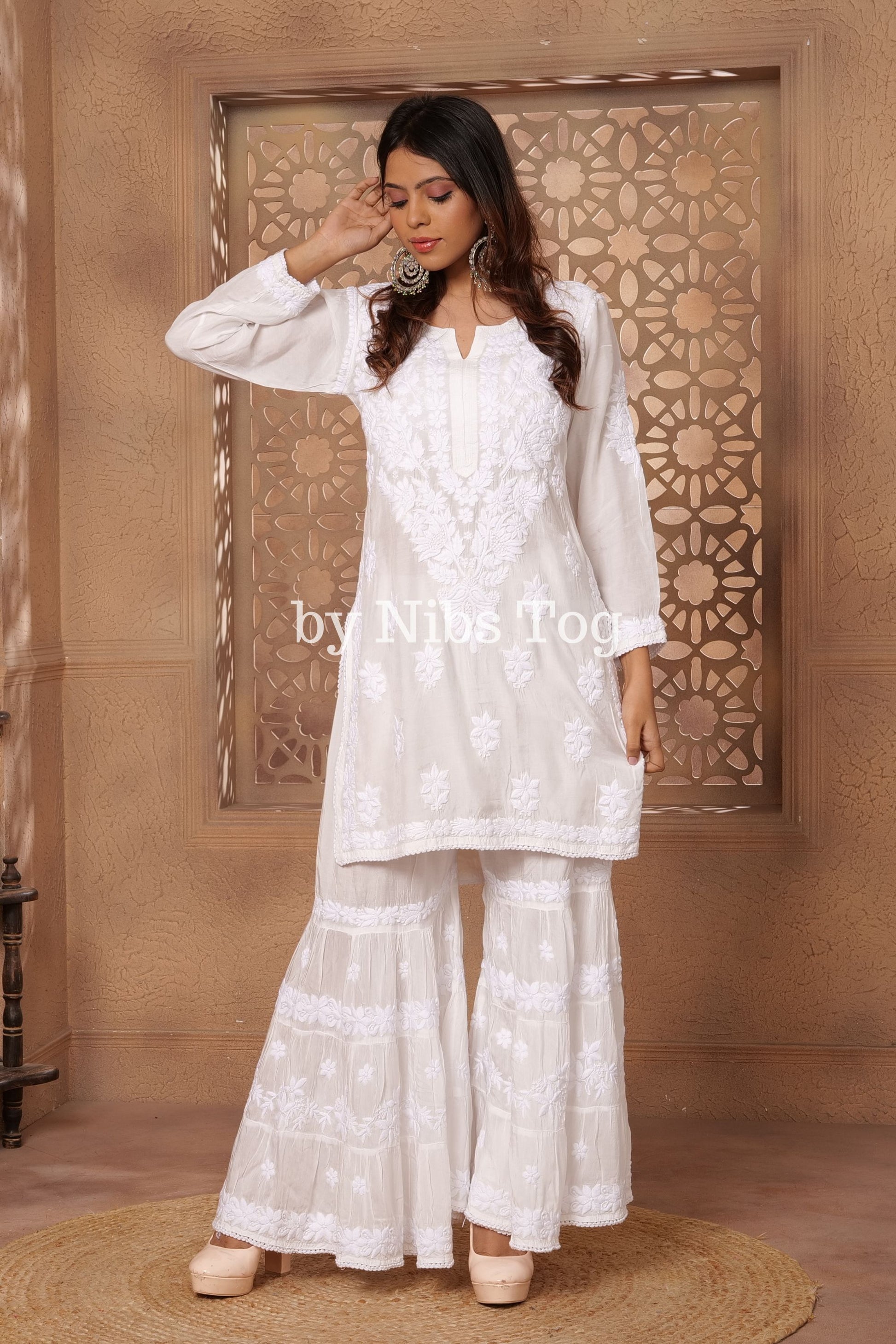 The White Chikankari Garara Set is made of pure muslin cotton fabric for comfort with beautiful embroidery for a perfect elegance.