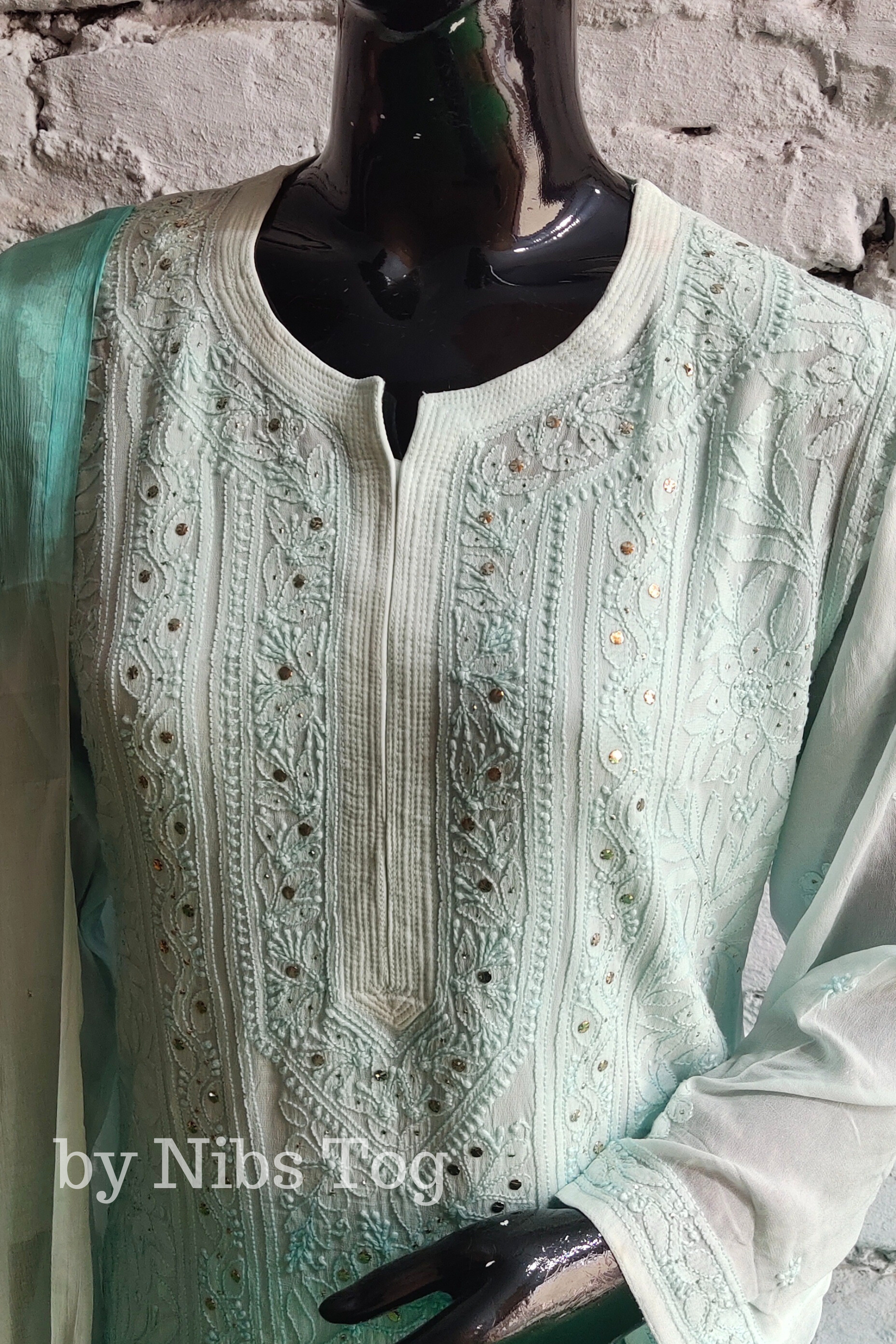 Explore our exquisite Ombre Sea Green Chikankari Kurta! This ensemble boasts intricate chikankari embroidery artfully handcrafted, accentuated with shimmering mukaish embellishments that catch the light with every move.