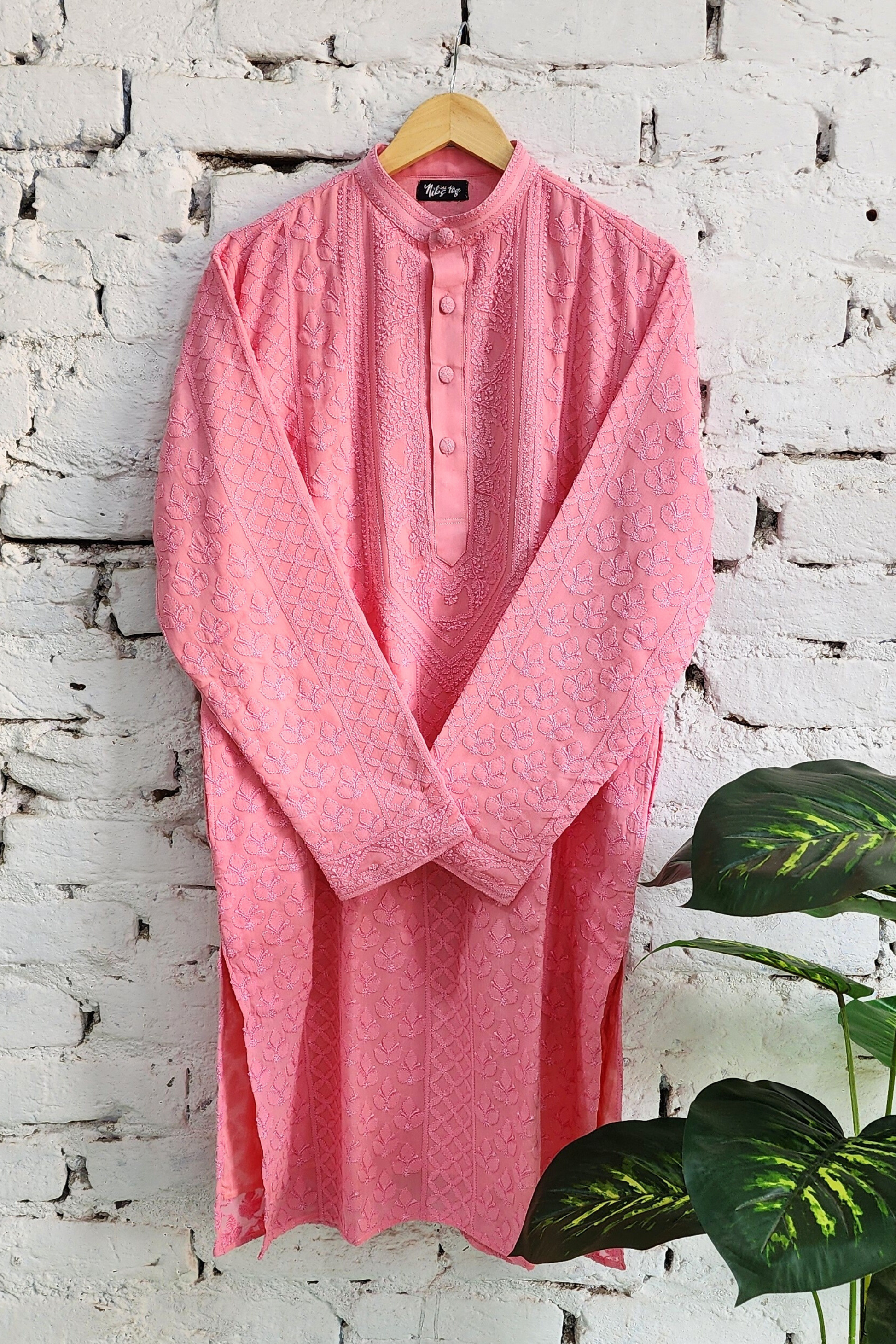 Step into timeless elegance with our Coral Pink Handmade Chikankari Kurta for Men, crafted with heritage embroidery and contemporary comfort. Perfect for weddings, festive occasions, or traditional gatherings, this kurta set beautifully blends craftsmanship with sophistication.