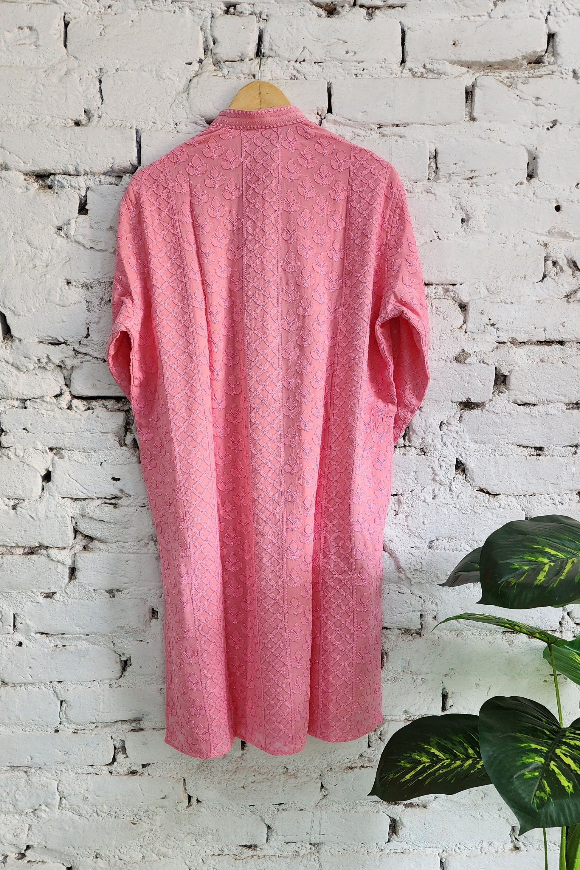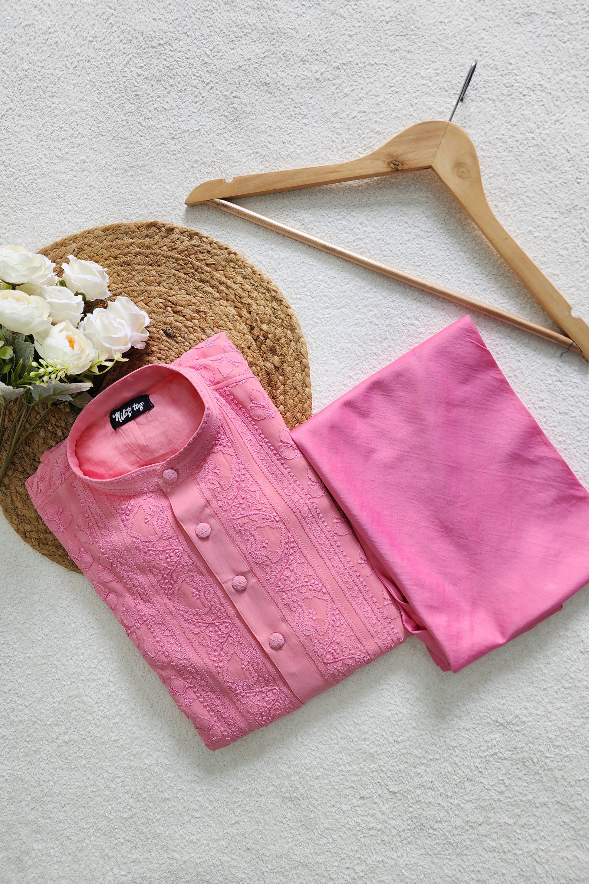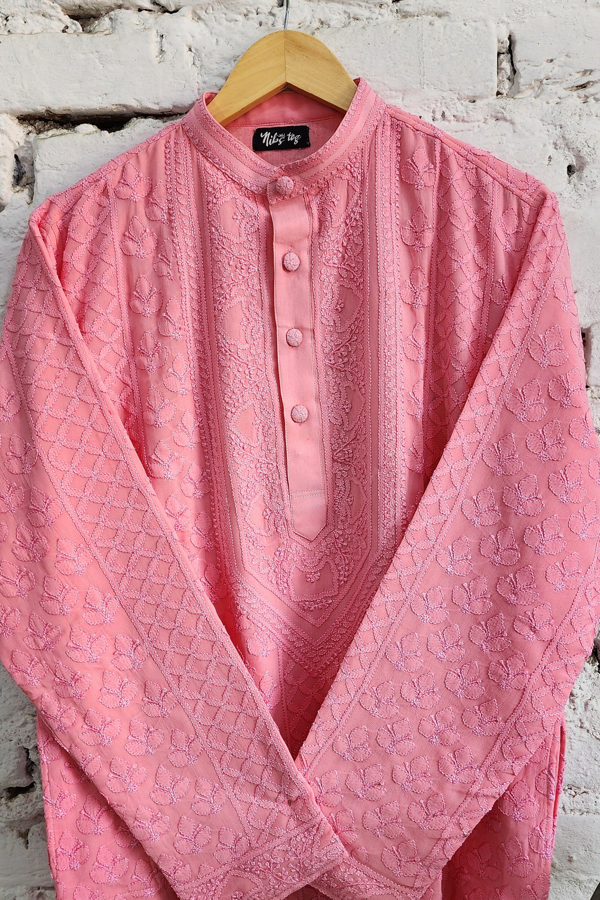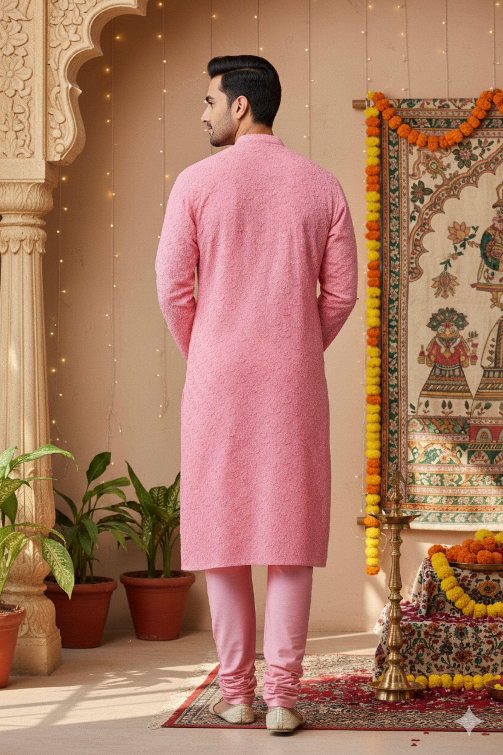 Embrace the charm of timeless artistry. Add this handcrafted Pink Mens Chikankari Kurta Set to your collection today and celebrate every occasion with unmatched elegance.