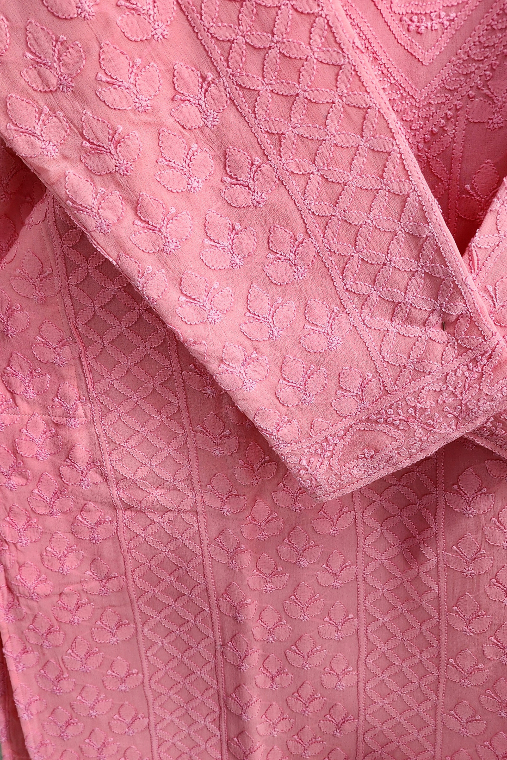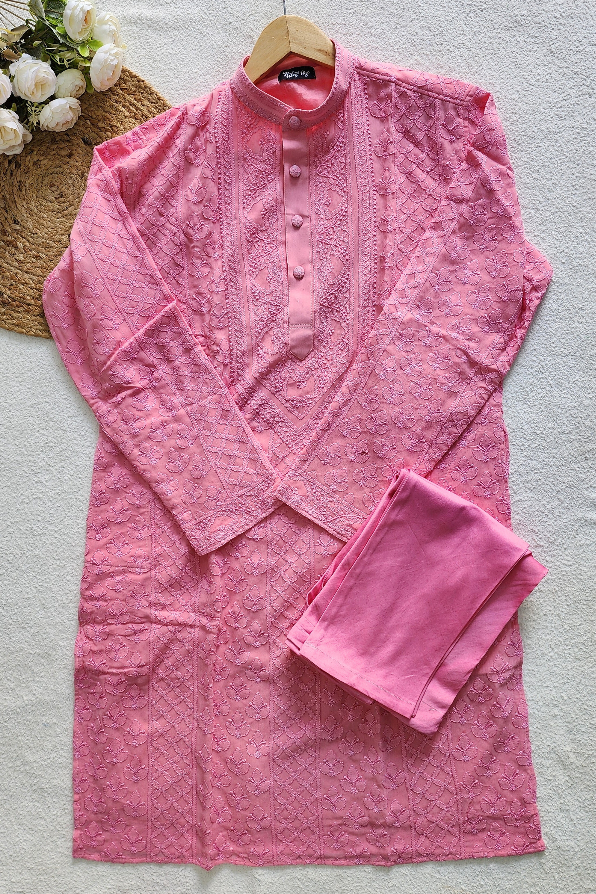 Pink Mens Chikankari Kurta with churidar Pure Viscose Georgette