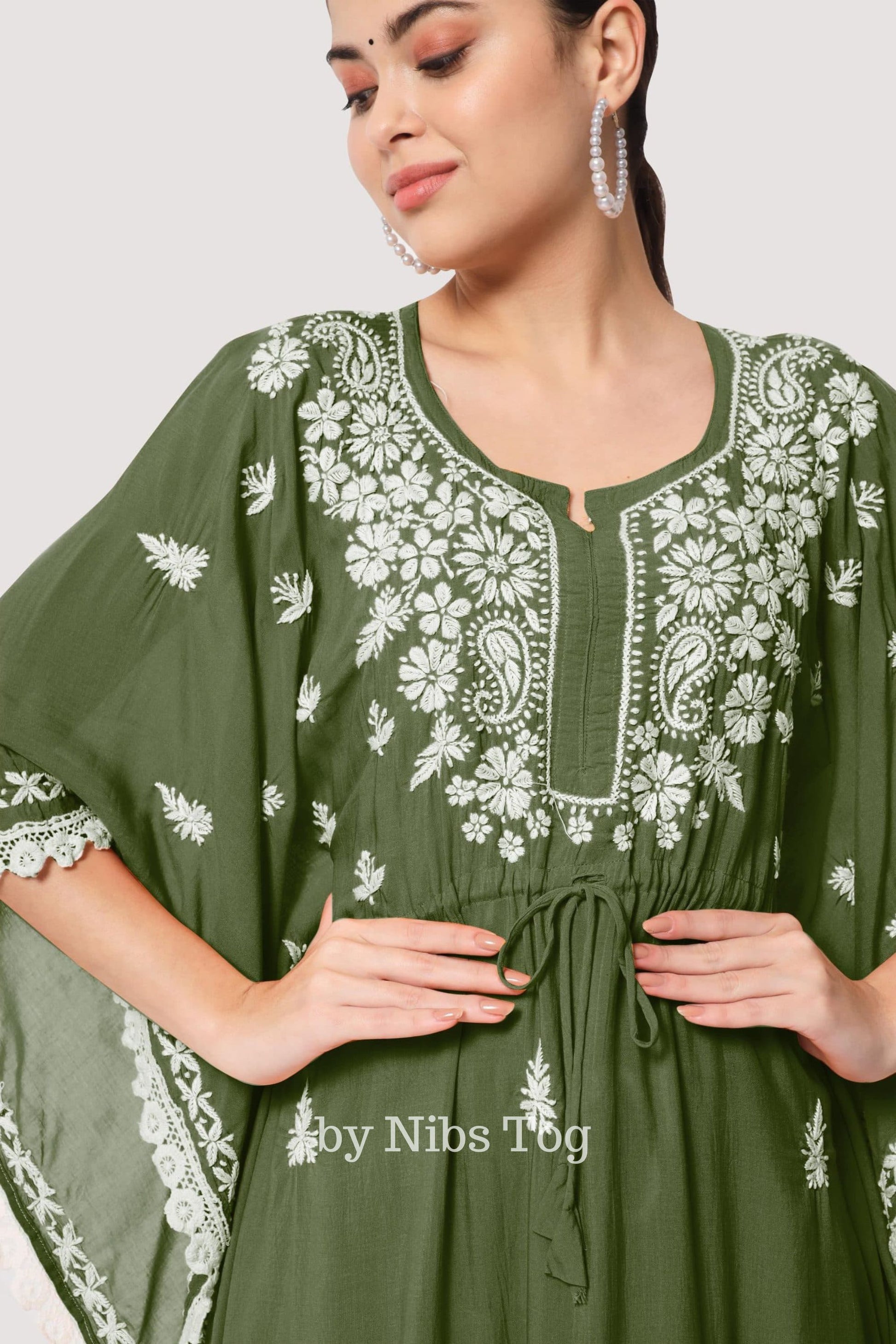 The Chikankari Kaftan Dress can be styles for any casual day, at home for your comfort or you can carry the Kaftan for Beach Cover Up, It can be Kaftan for Resort Wear and any Holiday Dress or More.