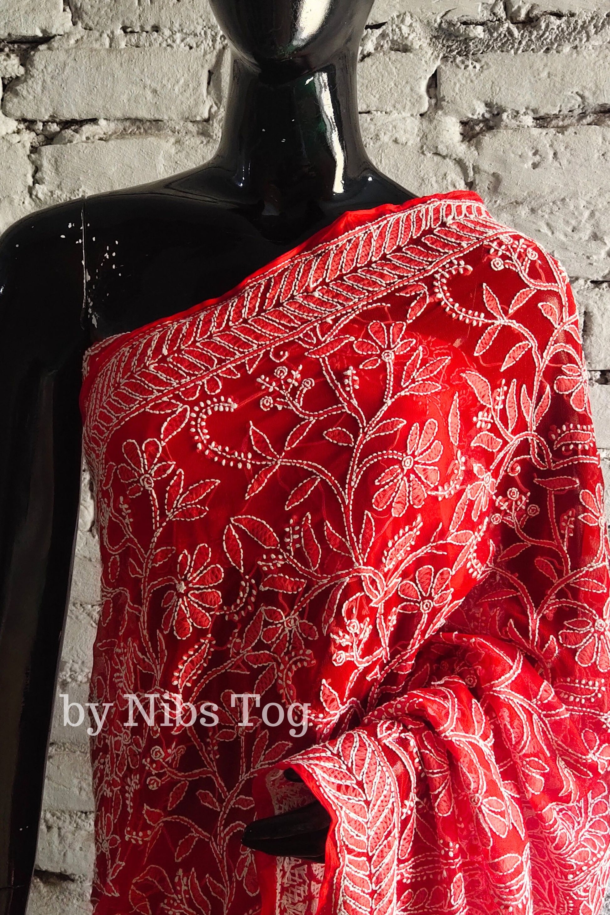 Nibs Tog Handmade Red Georgette Chikankari Saree for Women full Jaal Work