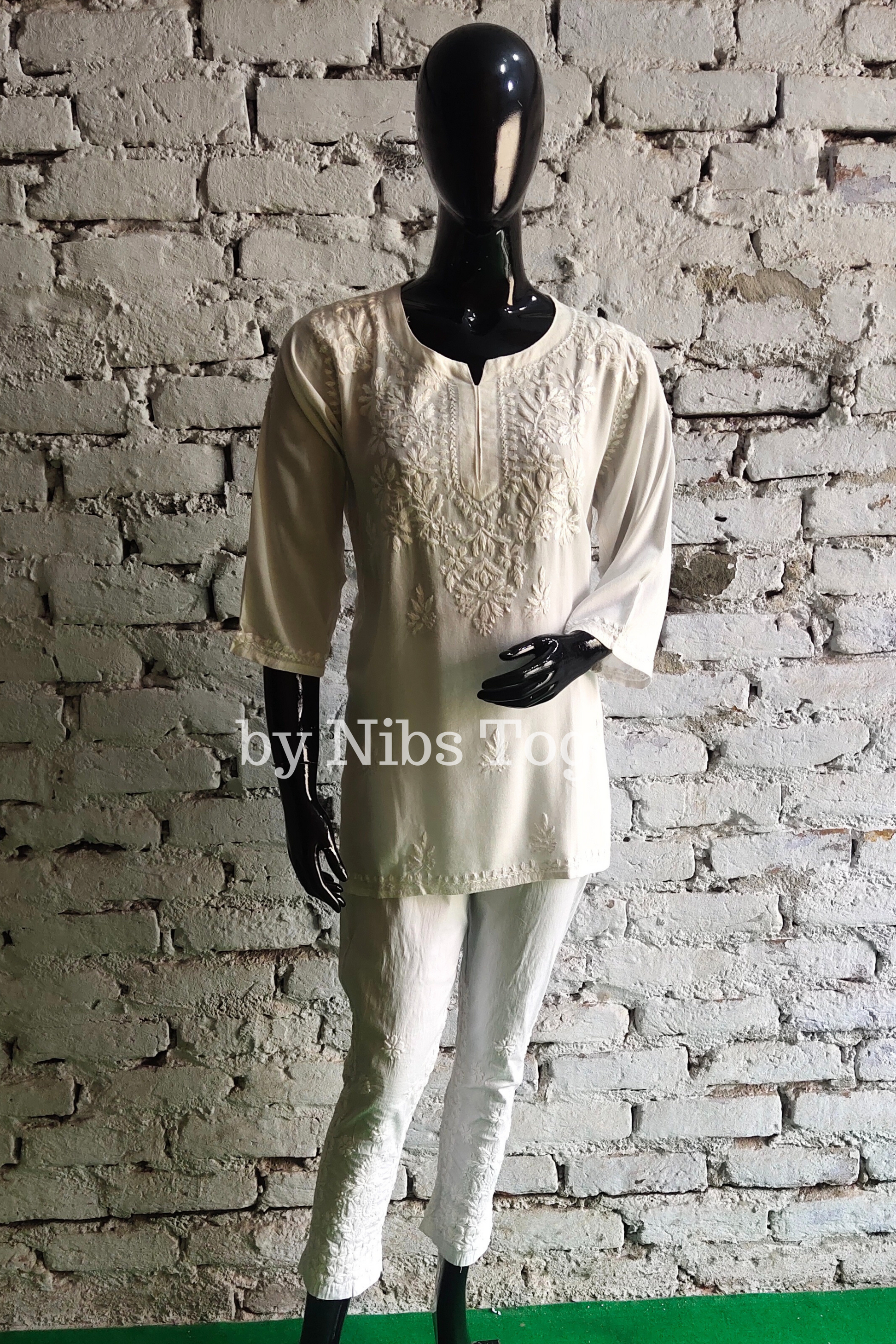 Introducing our classic White Rayon Cotton Chikankari Short Kurta.