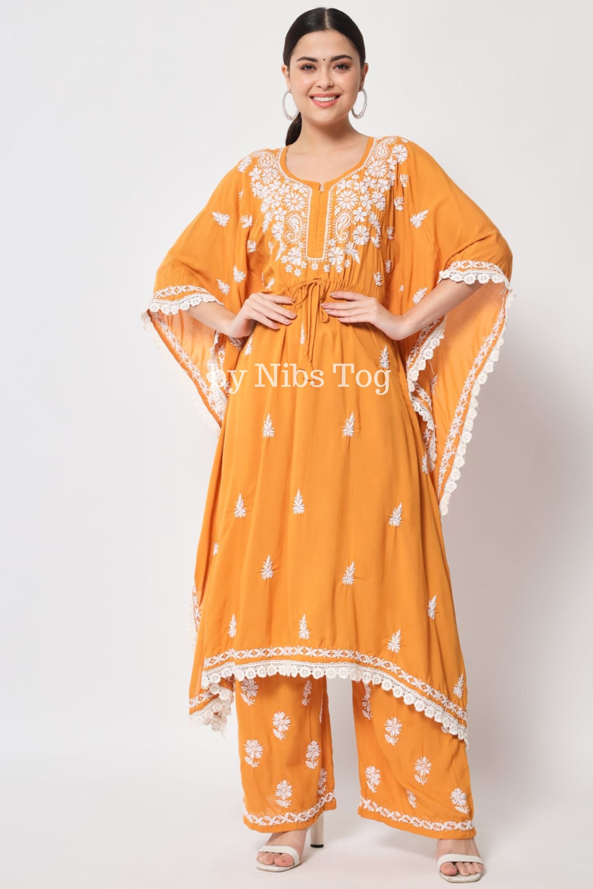 Beautifully crafted with different motifs of Chikankari, well finished with lace work, Presenting you this beautiful Chikankari Kaftan Set with Palazzo, Check full details below.